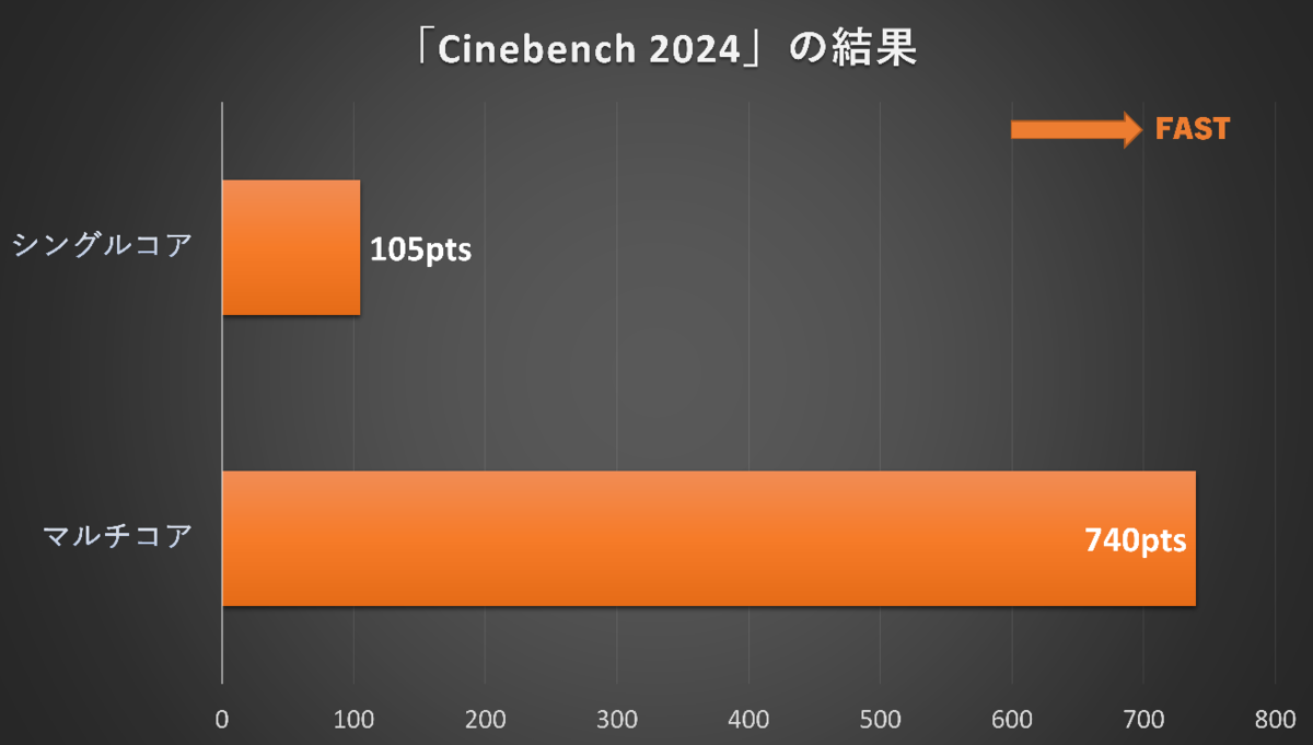 まず、CPU性能を測る「Cinebench 2024」を実行した。結果は、マルチコアが740pts、シングルコアが105ptsで、ミドルクラスの性能となっている。Cinebenchはコア数とスレッド数が物をいうが、ビジネス用途なら10コア/16スレッドあれば、処理能力として不満に感じることはない。