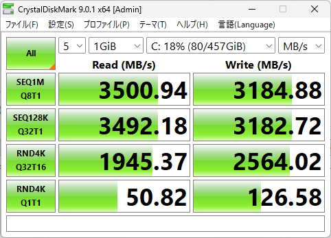ストレージ性能は、「CrystalDiskMark 9.0.1」を実行したところ、シーケンシャルリードが3500MB/秒、シーケンシャルライトが3184MB/秒とPCIe 3.0性能のSSDだが、ランダム性能も高く、ビジネスにおいては十分な速度域だろう。