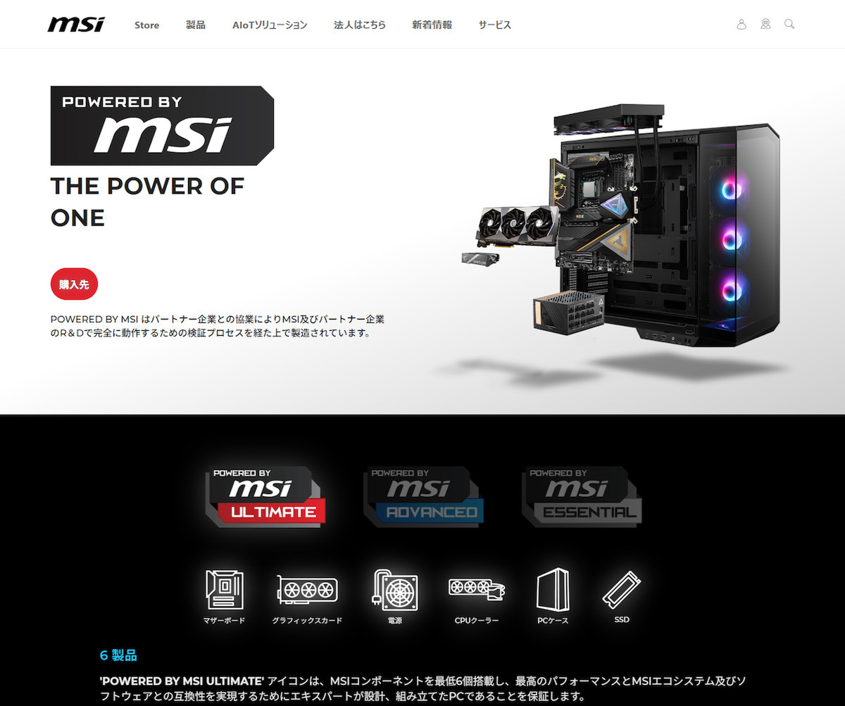 「Powered by msi」ではMSI製品を採用していることが根本の条件だ。マザーボード、ビデオカード、電源、CPUクーラー、ケース、SSD……といったMSI製パーツの中から、MSI製品の採用数に応じEssential、Advanced、Ultimateと3つのグレードが設定されている。最小ではマザーボード+そのほかのMSI製品がひとつ、最大では6つ(上記で挙げたすべて)のMSI製品で構成されるといった具合だ。また、「Powered by msi」のパートナーはここで紹介するSerialTec Japan「Panoplia」のほか、大手PCパーツショップやBTOパソコンメーカーなど執筆時点で7社が名を連ねている。パフォーマンスや見た目の選択肢も幅広い。