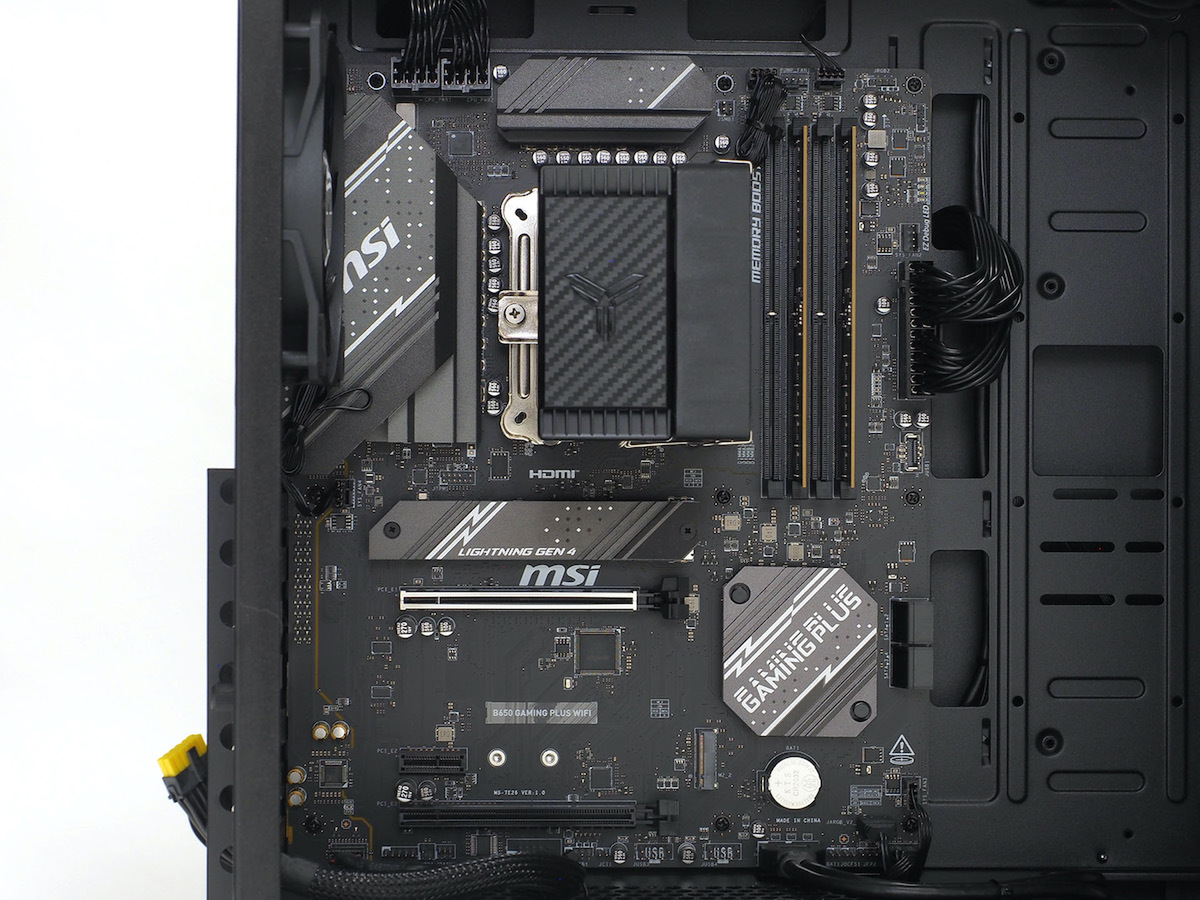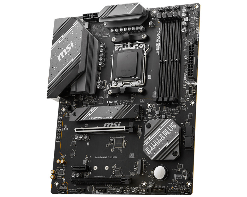 まずは当然マザーボード。AMD B650チップセットを採用するATXマザーボード「B650 GAMING PLUS WIFI」が採用されている。メモリは4スロット、拡張スロット3本というのは一見少なく見えるが、下2本はともにビデオカードの占有されない位置なのでゲーミングPCでも問題なく拡張カードが挿せるという点での最大数と言える。