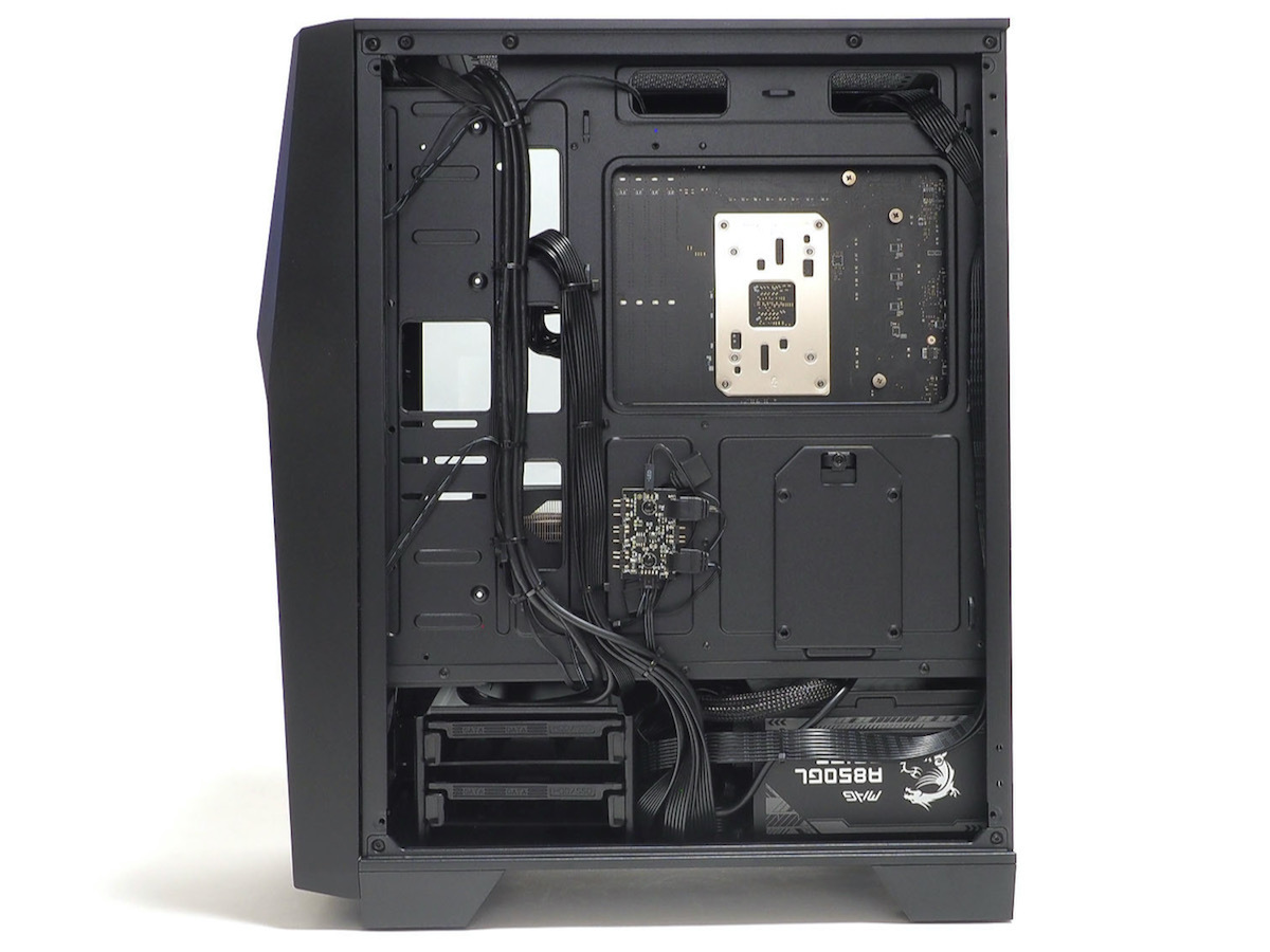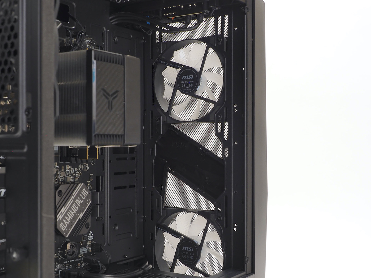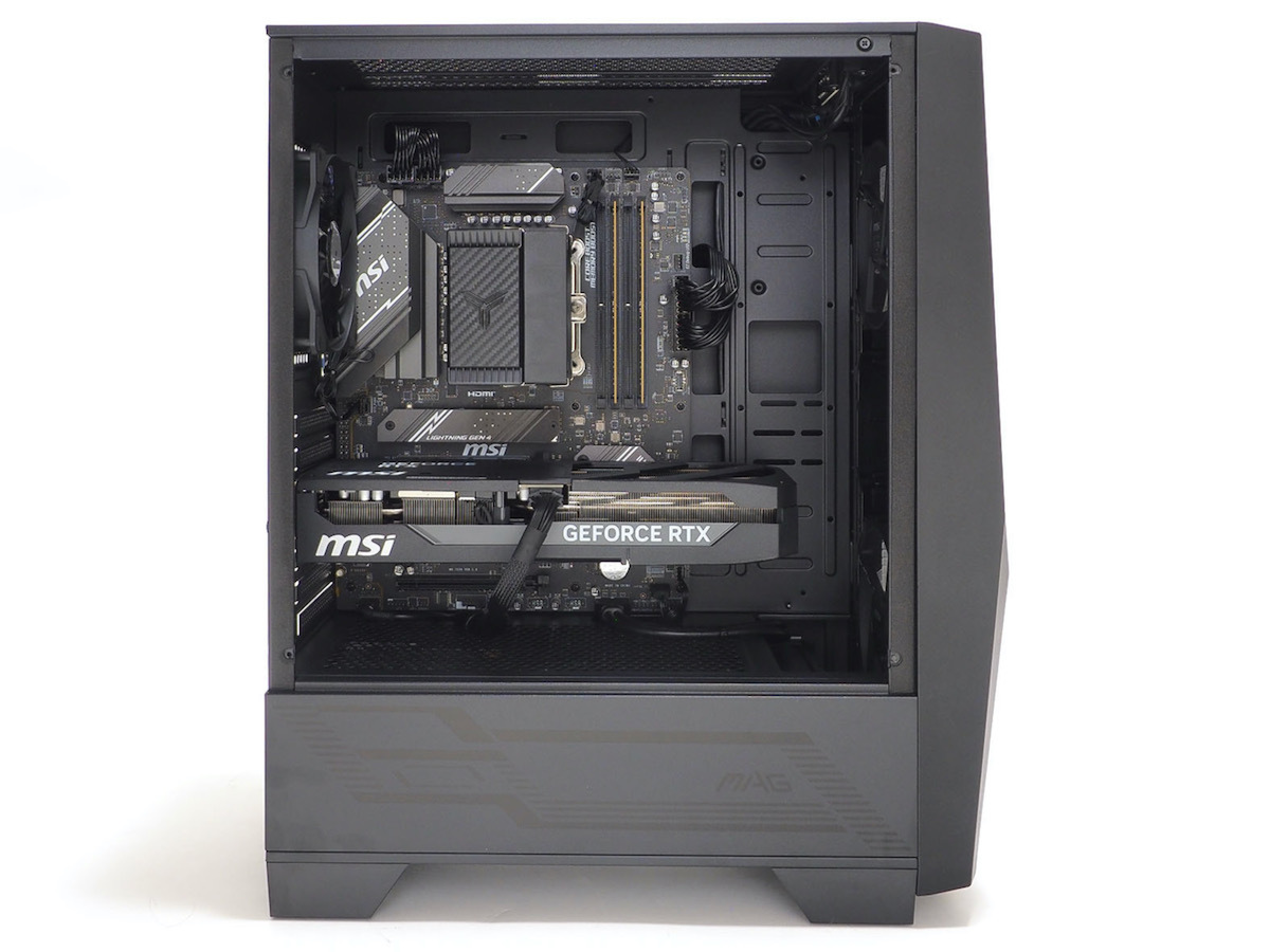 続いてケース。「MAG FORGE 100M」が採用されている。ATX対応のミドルタワーだが奥行きがコンパクトで扱いやすいサイズ感だ。それでも搭載可能なビデオカードの最大長は330mmと、エンスークラスの超大型ビデオカードを除けばハイエンドまでおおむね搭載できる。先の「GeForce RTX 5070 Ti 16G SHADOW 3X OC」(303mm)ならフロントファンとの間にまだまだ十分なスペースがある印象だ。