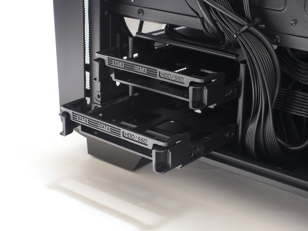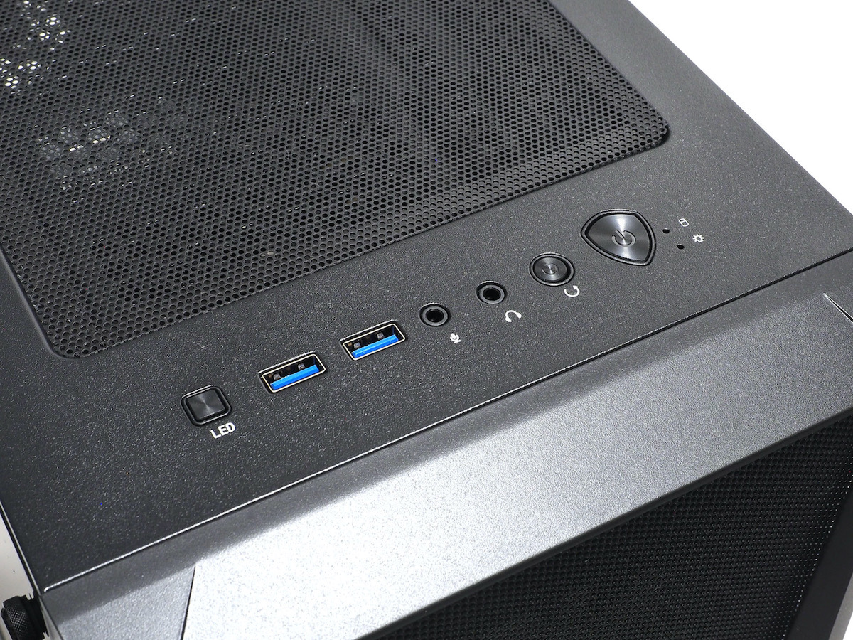 デザインはいわゆる「ゲーミング」感が強め。この製品が初登場したのが2020年頃で、その時代のトレンドといった印象だ。また、フロントUSBが2ポートでともにType-A、そしてType-Cなしといったところも時代を反映している感がある。ケースファンはフロントが吸気用12cm角×2基(ARGB LED搭載)、リアが排気用12cm角×1基だ。なお、本製品でARGB LEDが搭載されているのはケースのフロントファン2基のみ。視界に入るフロントなのでゲーミング気分はバッチリ、一方のサイドはスモーク仕様もあってうっすら見えるくらいの落ち着き感がある。