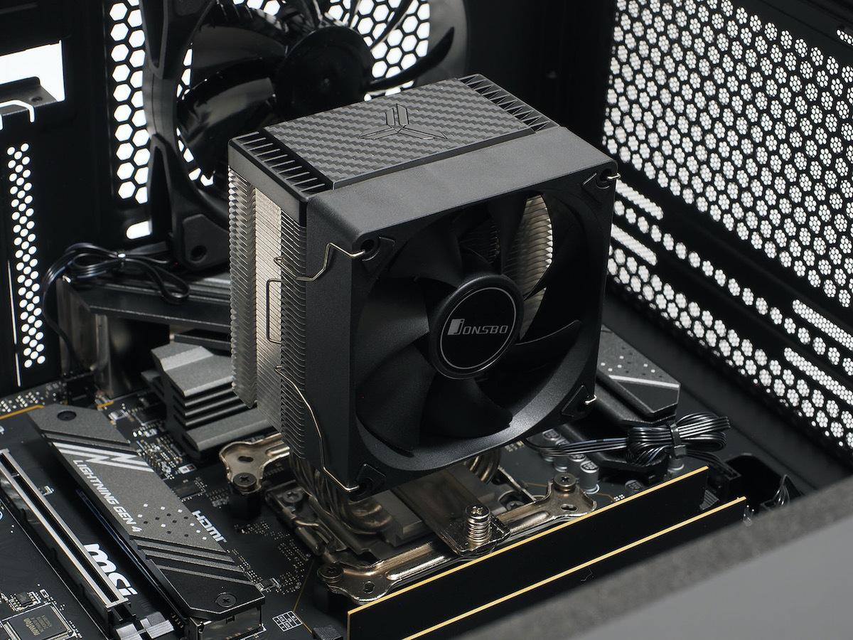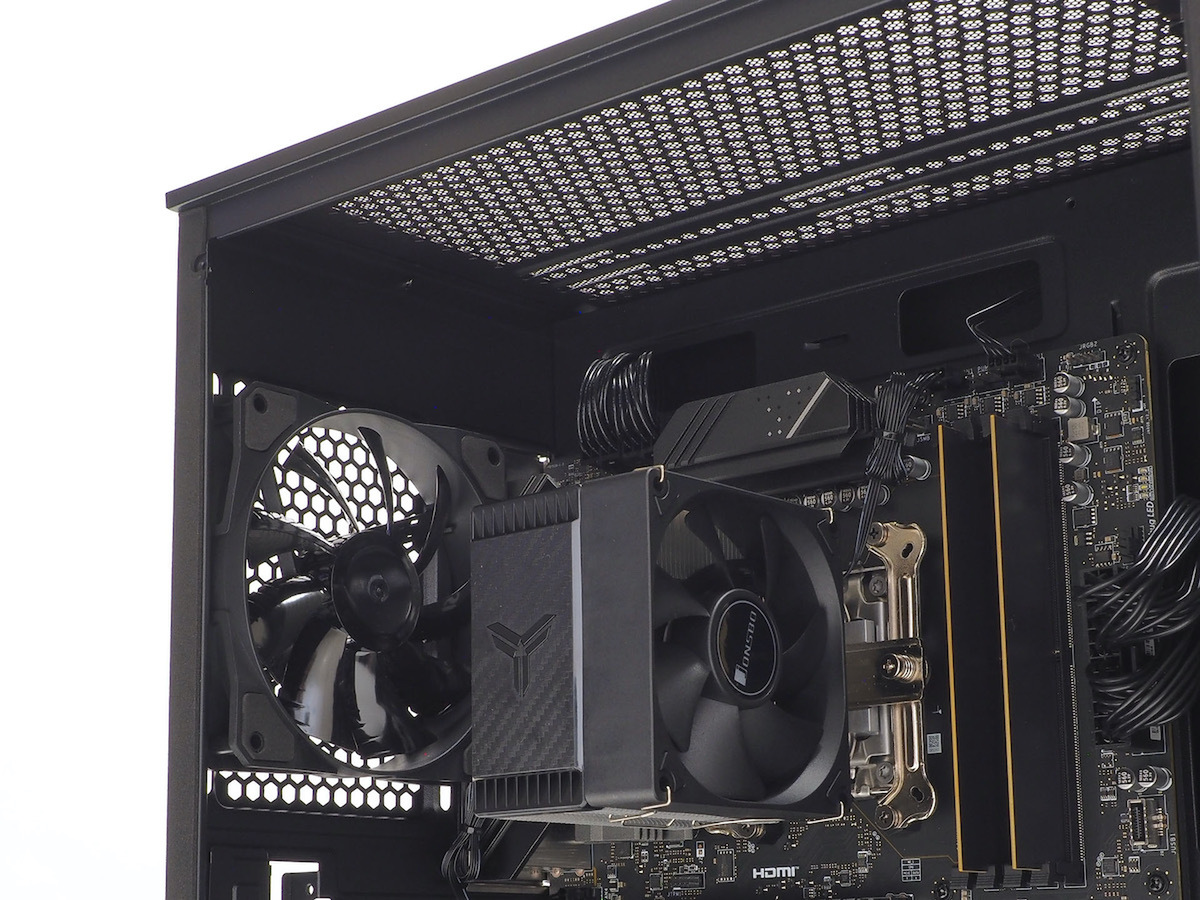 CPUクーラーはJONSBO「CR-1400 EVO BLACK」を採用している。9cm角ファンを搭載する空冷CPUクーラーで、ヒートシンク部にはトップパネルを装備、ファンのフレームもフラット造形で一体感のあるデザインだ。