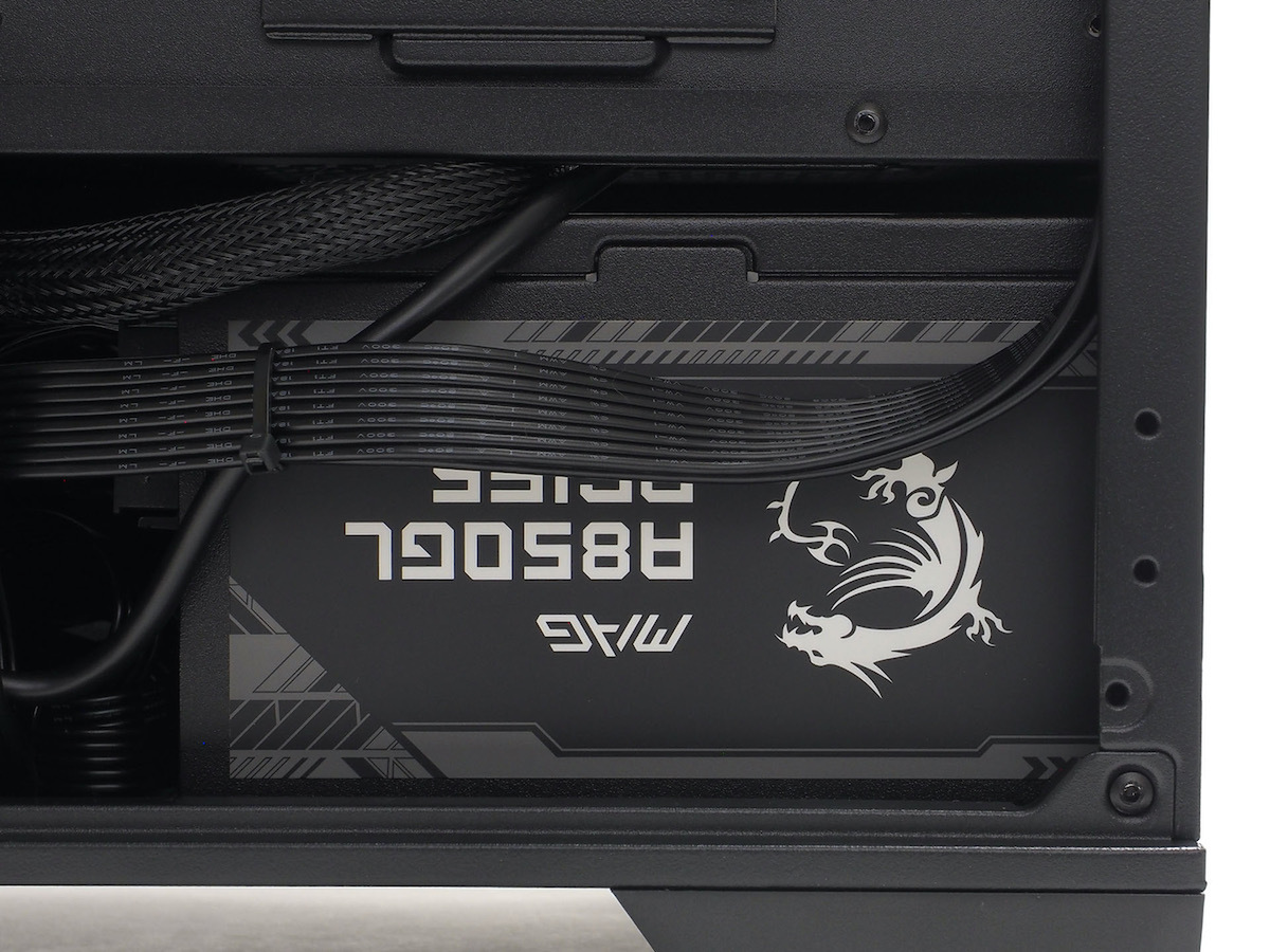 最後に電源。「MAG A850GL PCIE5」が採用されている。GeForce RTX 5070 Tiの推奨システム電力が750W。実際にはこれより余裕を見積もるのが一般的なので850Wという定格出力はムダというよりは安心材料。80PLUS Gold認証なので変換効率もよい。