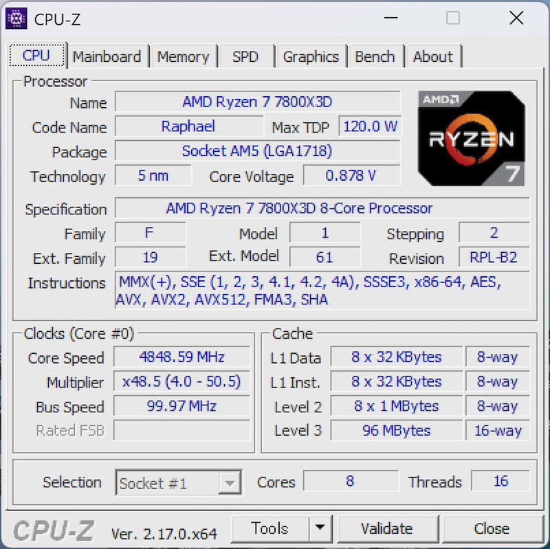 ほかのMSI製品以外のパーツについても軽く触れておこう。まずCPUはAMD Ryzen 7 7800X3D。ひとつ古い世代ではあるがゲーミングに強い3D V-Cache搭載「X3D」を採用。Ryzen 7なので8コア16スレッドとコア/スレッド数も強力だ。
