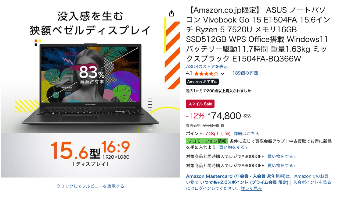 Amazonスマイルセールで、ASUSの人気ノートPC「Vivobook Go 15 E1504FA」が12%オフの74,800円で登場。