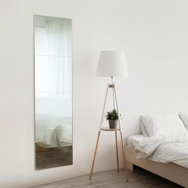 裏面粘着シールで簡単に壁に設置可能。クローゼットやドアの裏、玄関など、ガラス鏡では設置できなかった場所にも手軽に鏡が出現します。4枚セットのため、縦に並べれば姿見鏡として、バラして貼ればインテリアとしても活用できます。