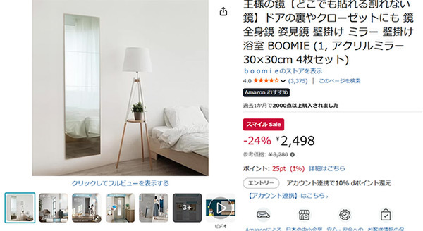 部屋が狭くて全身鏡を置けない、地震で鏡が割れるのが怖い...という悩みを解決! BOOMIE(ブーミィ)の「王様の鏡」(割れないアクリルミラー)が、Amazonスマイルセールに登場しました。