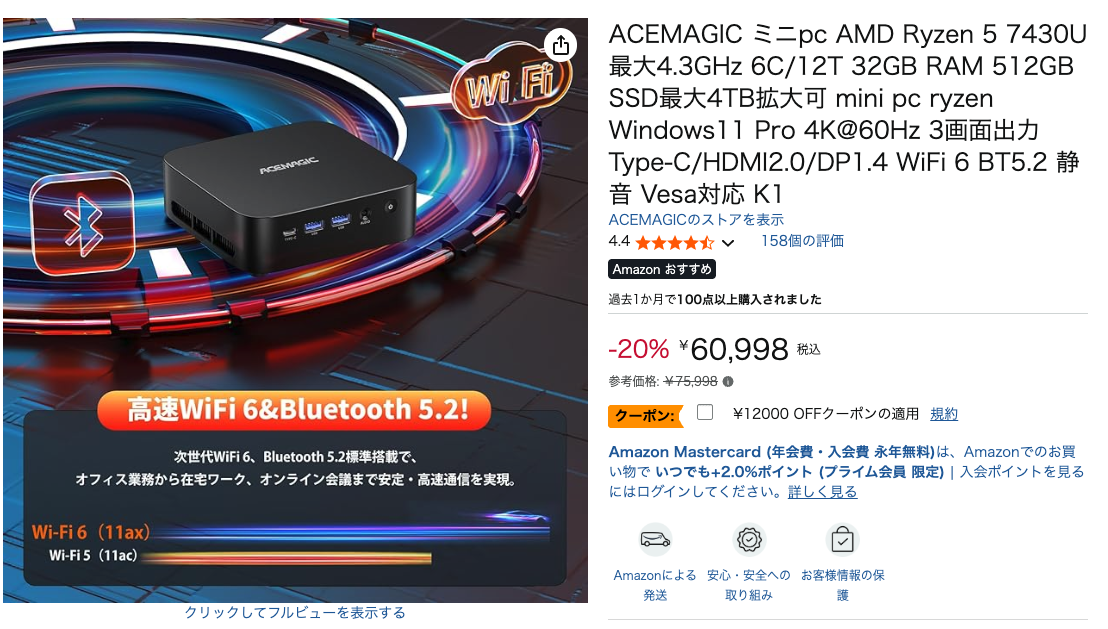 参考価格75,998円が、いまAmazon公式ストアで60,998円(20%オフ)+12,000円OFFクーポンのW割引中!