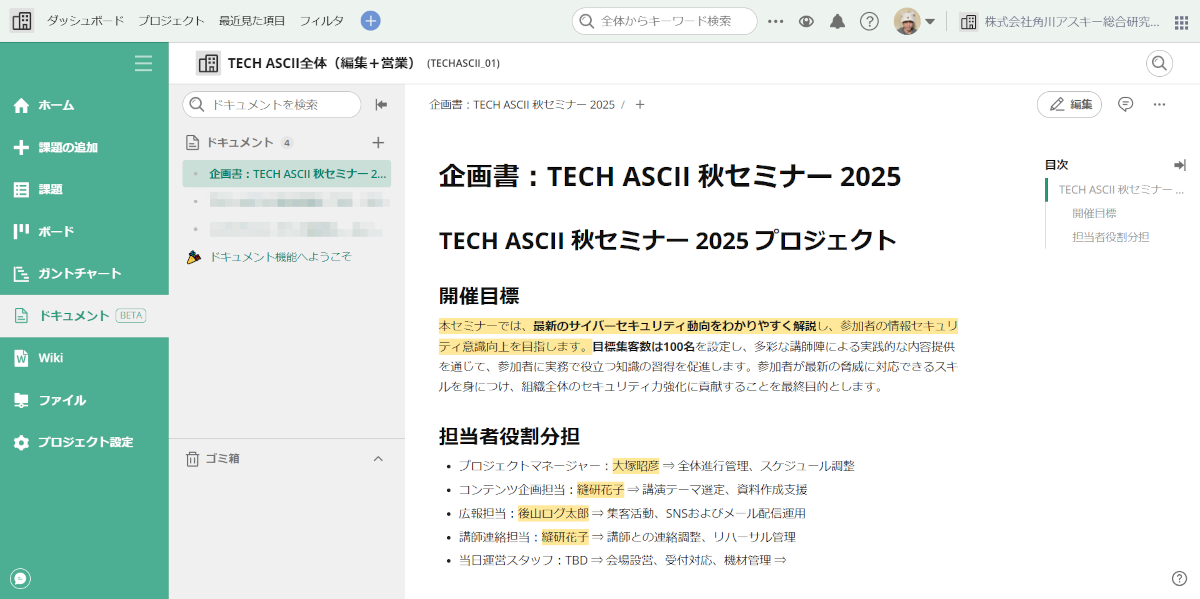 展示会の概要など共有すべき情報は「Wiki」に記載しました。後からプロジェクトに入ったメンバーからも「情報がまとまっていてわかりやすかった」との声がありました。関連するドキュメントやファイルなどもすべてBacklog上で共有することで、効率的に情報の集約ができたと思います。