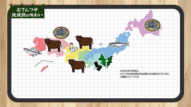 セブン‐イレブンのおでんは、地域の食文化に合わせて7エリアごとのだしを採用しており、昆布や鰹を中心に、牛すじや鶏、あごだしなど、土地の味を生かしたつゆが特長です。