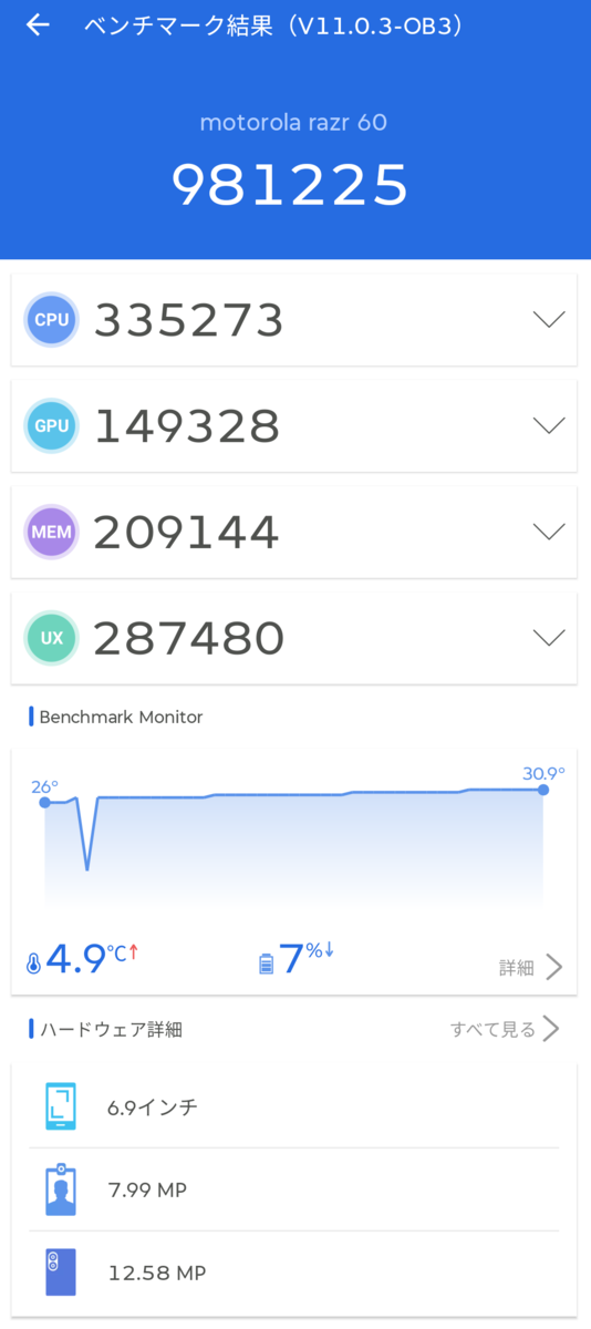 性能面に関しても、12GBメモリーとCPUにMediaTekのDimensity 7400Xを搭載しており、普段使いでのストレスはほとんど感じません。アプリ起動やウェブ閲覧、SNS利用、写真・動画撮影もサクサク動作します。