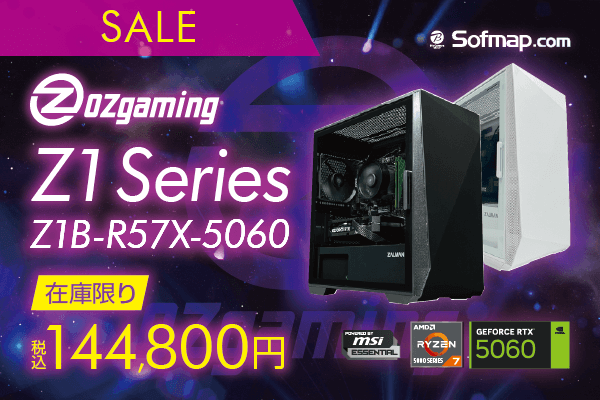 ソフマップは、OZgamingの最新ゲーミングデスクトップPC「Z1B(W)-R57x-5060」を在庫限りの特価144,800円で提供中だ。