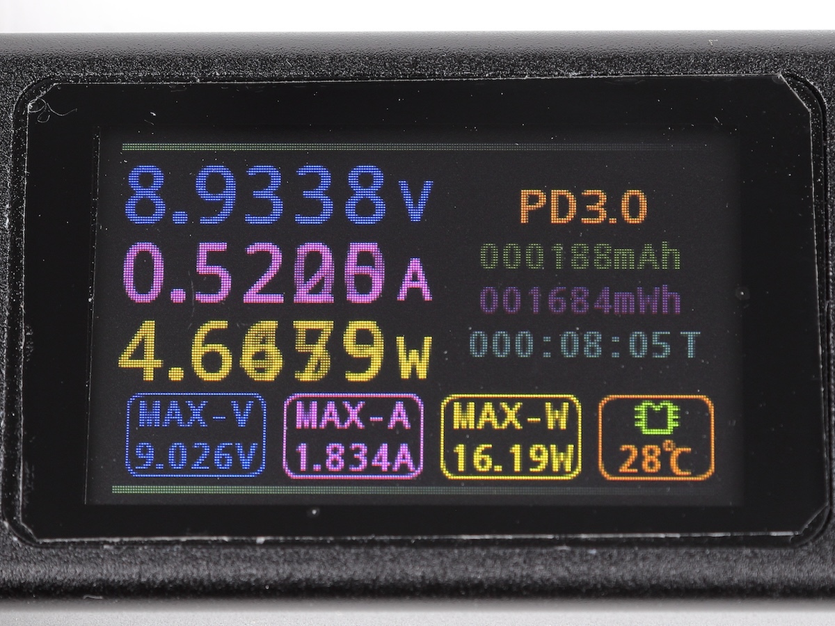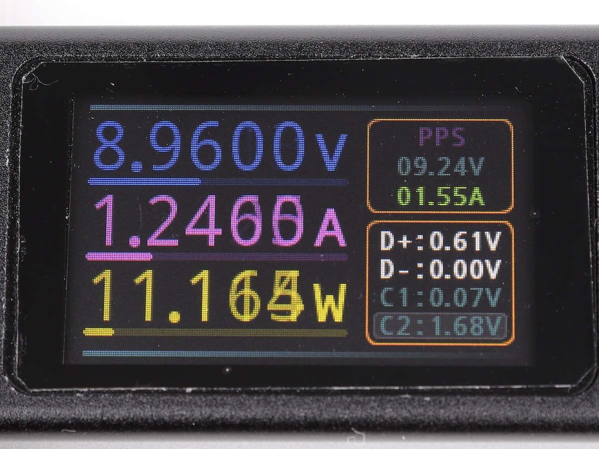 見たい情報に合わせて画面を切り替えればいいだけなので、難しいことはありません。個人的によく使うのは、充電モードがわかる1つ目の画面。機器間で調整した電圧と電流の値(PDOなど)と、実際の値とが1画面で確認できるのが気に入っています。