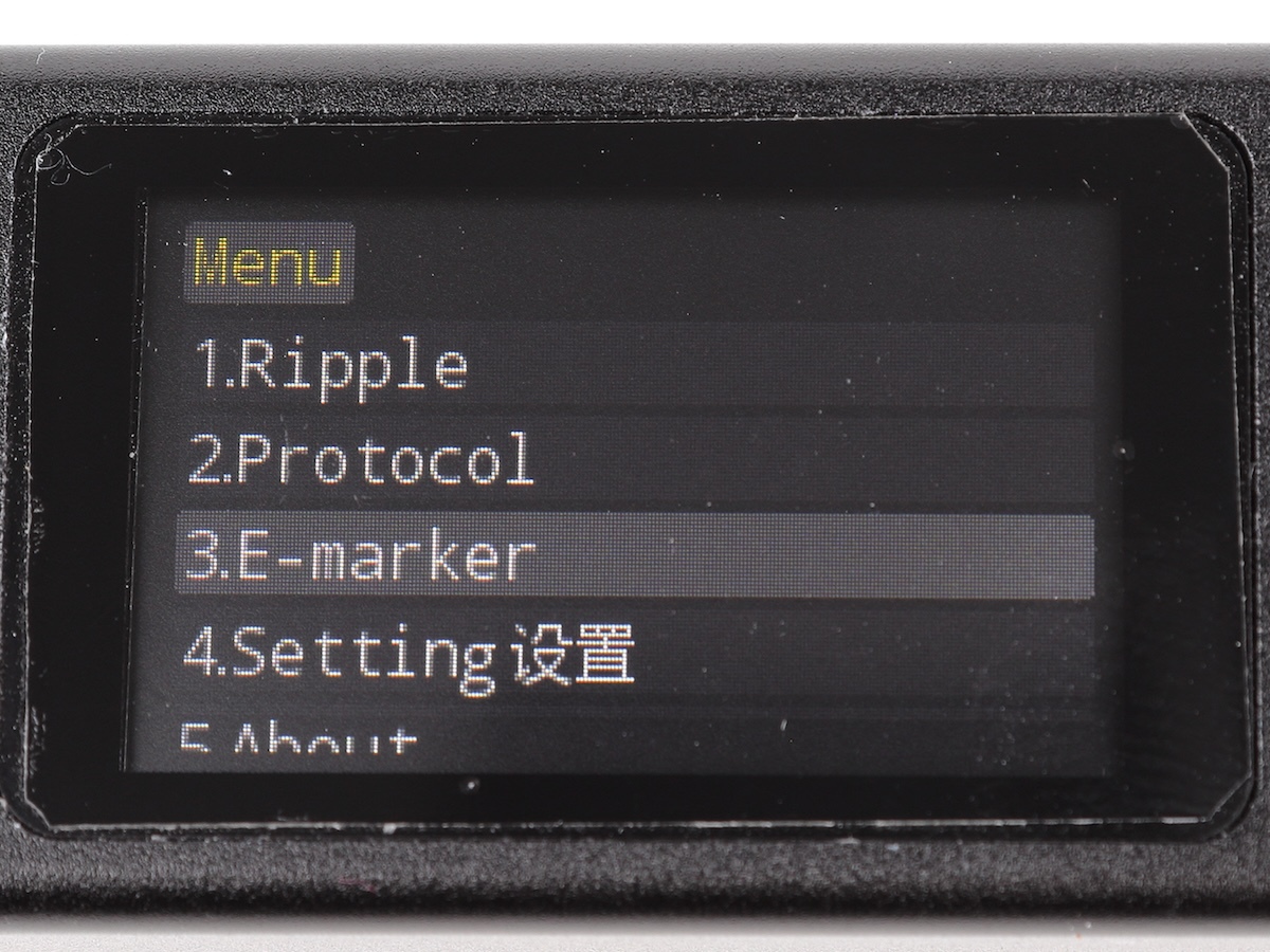 まずはSinkモードをONにして、USB充電器と接続。このとき、調べたいケーブルで接続するようにします。BACKボタンを押してメニューを表示し、「3 E-marker」を選びましょう。