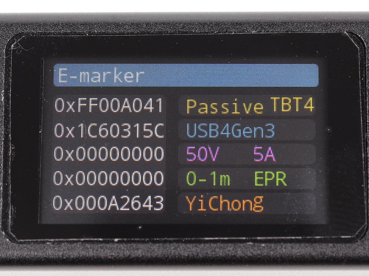 また、eMarkerがあるのにKWS-X1だと読めないケーブルがまれにあります。他のUSBテスターでは読めたりしますから、KWS-X1でこの表示が出ても、必ずしもeMarkerがない……というわけではない点には注意しましょう。