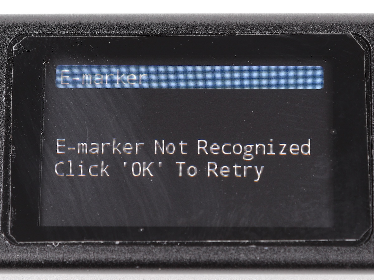 ちなみに、eMarkerがないケーブルの場合は、「E-marker Not Recognized Click 'OK' To Retry」と出て、情報が表示されません。