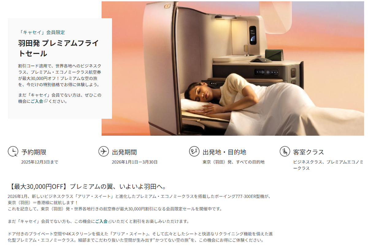 こうなると実際のフライトで乗ってみたいところです。節約トラベラーとしては、なかなか厳しいですが、現在キャセイのマイレージ会員限定で、ビジネスクラス、プレミアム・エコノミークラス航空券が最大3万円オフのセールも開催中(予約期限:2025年12月3日まで)。興味のある人は、チェックしてみてください!