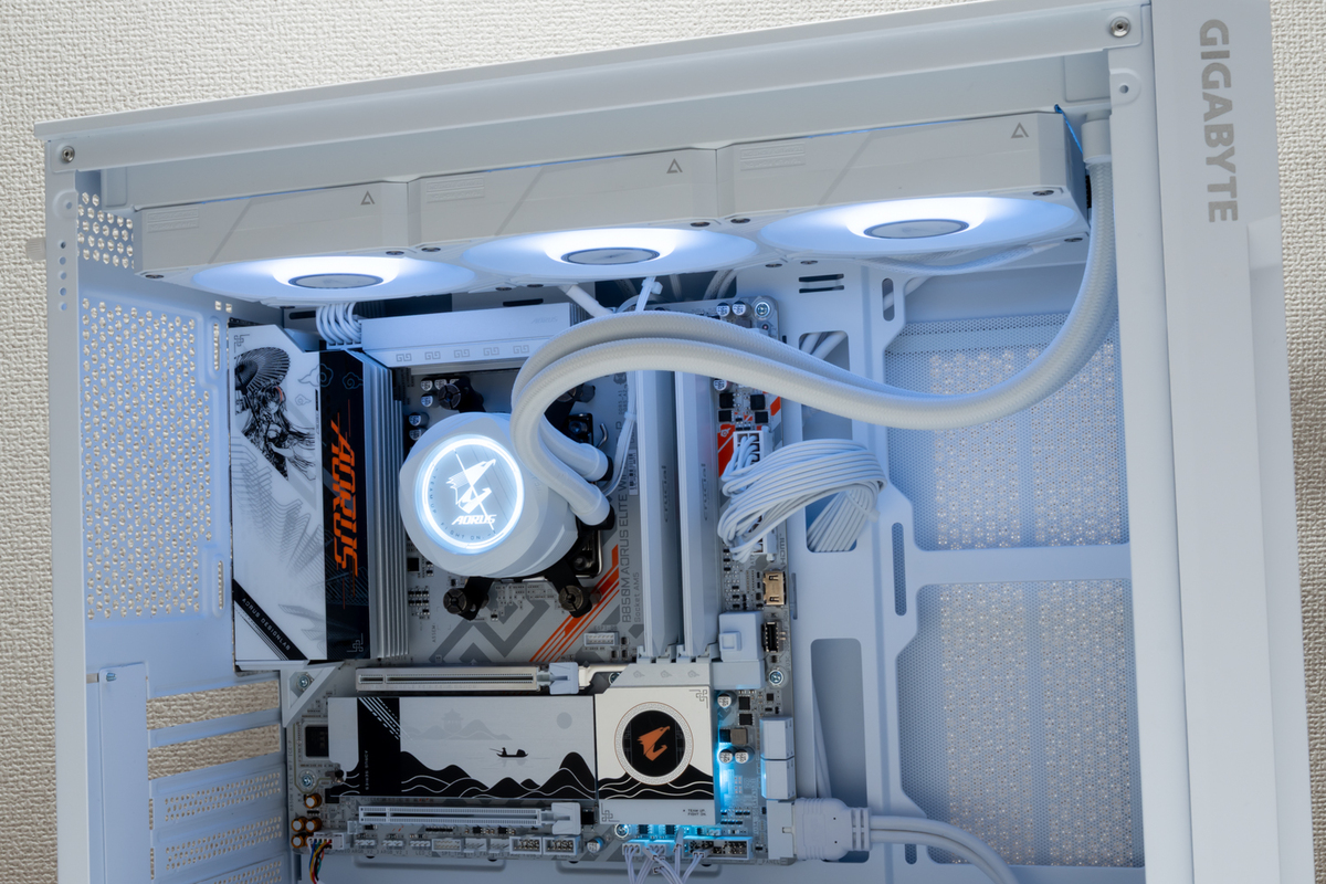 GIGABYTEはマザーボードに限らず、ビデオカードや簡易水冷CPUクーラー、PCケースでもICEシリーズを展開しているので、統一感のある白色で組めるのが魅力になる。そこで、GIGABYTE ICEシリーズに属するPCパーツを用意した。簡易水冷CPUクーラー「AORUS WATERFORCE II 360 ICE」、小型ミドルタワーPCケース「C102 GLASS ICE」、電源ユニット「UD850GM PG5 V2 ICE」だ。