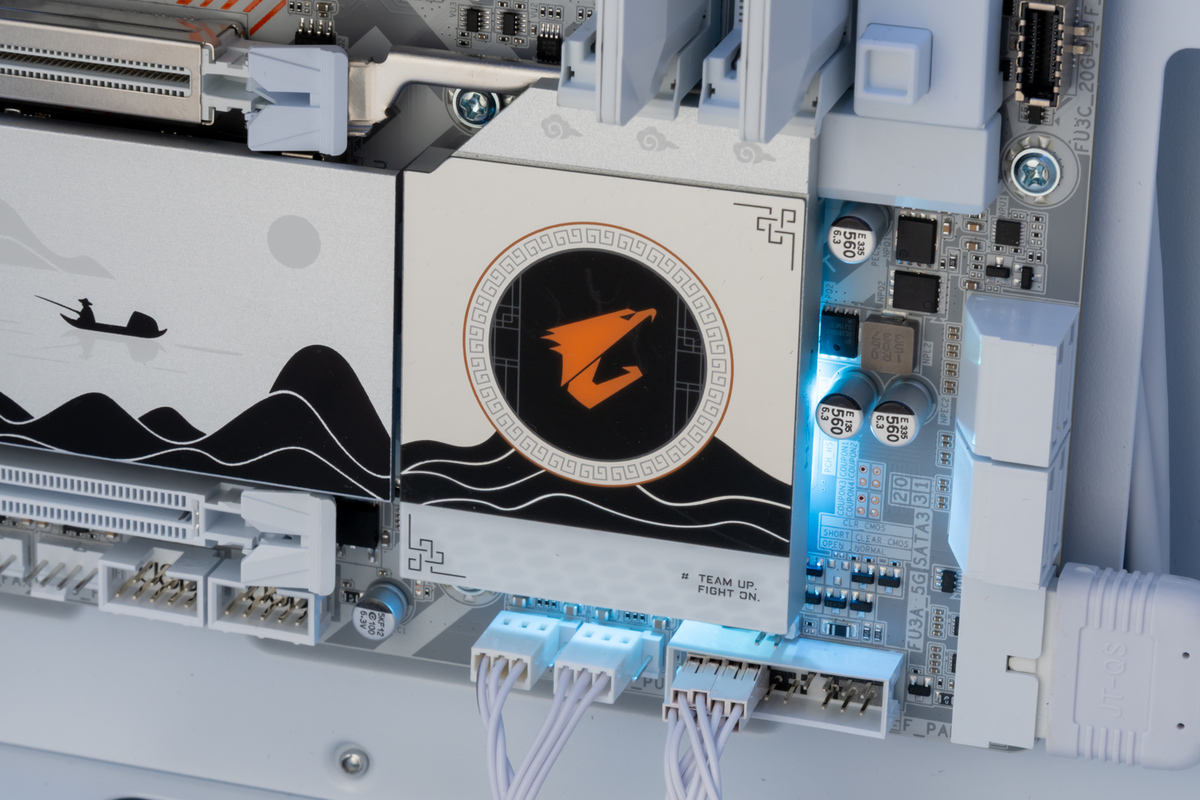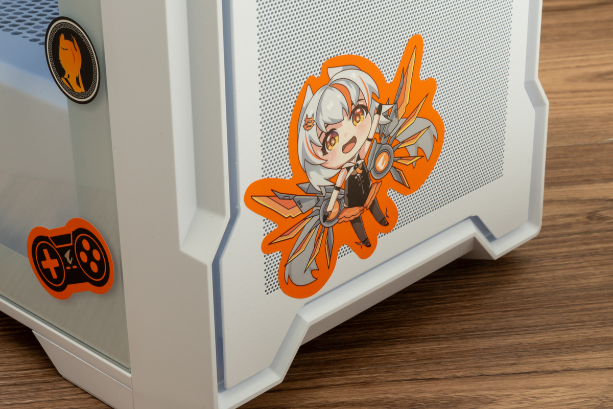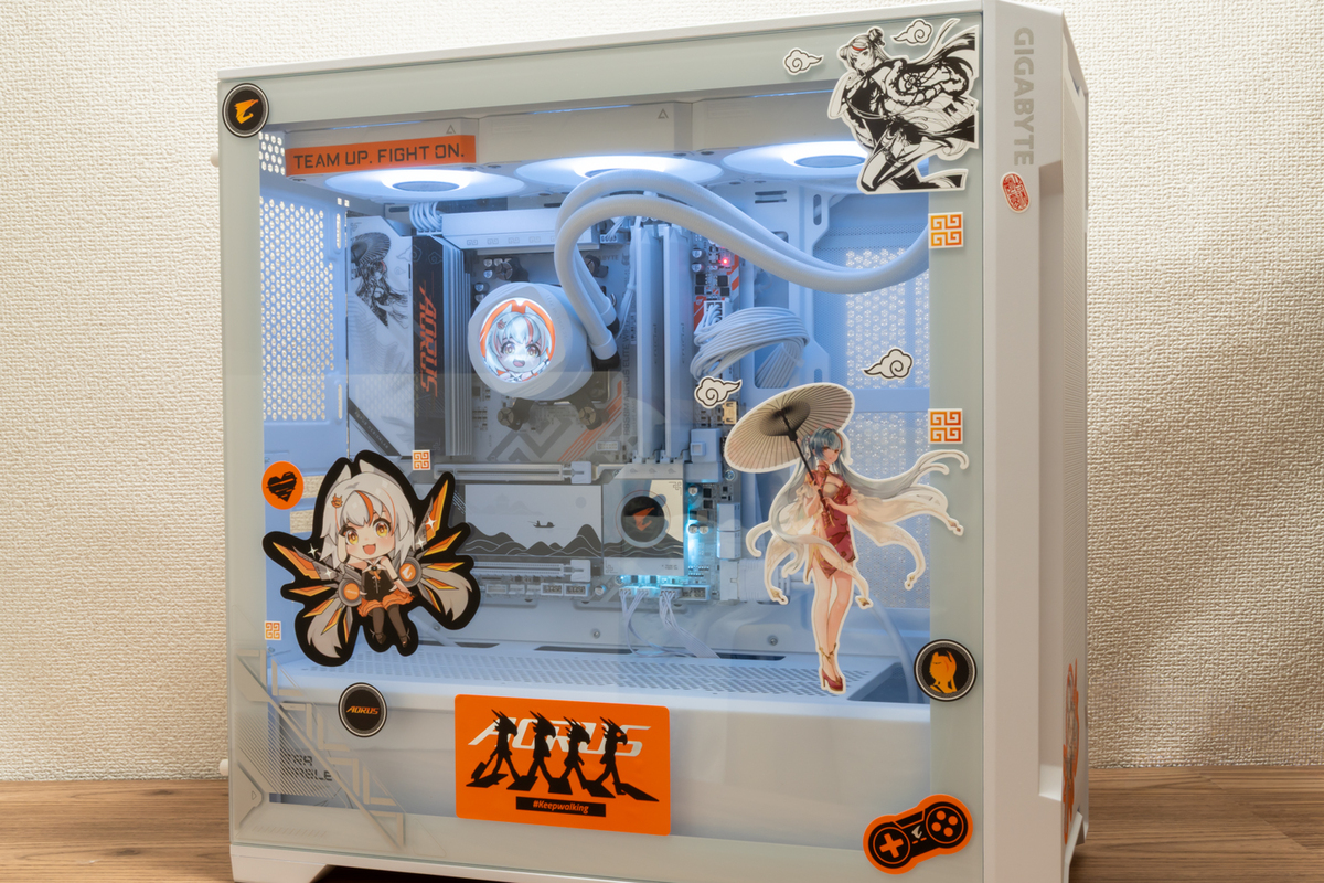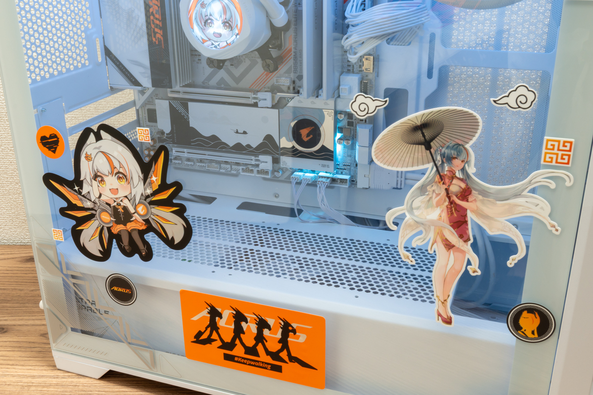 「B850M AORUS ELITE WIFI7 ICE-P」に付属するシールや、今後イベントなどで配布されるだろうAORUSのシールを使って、PCを飾ってみた。