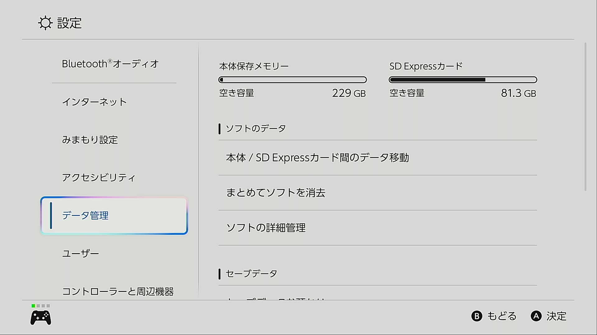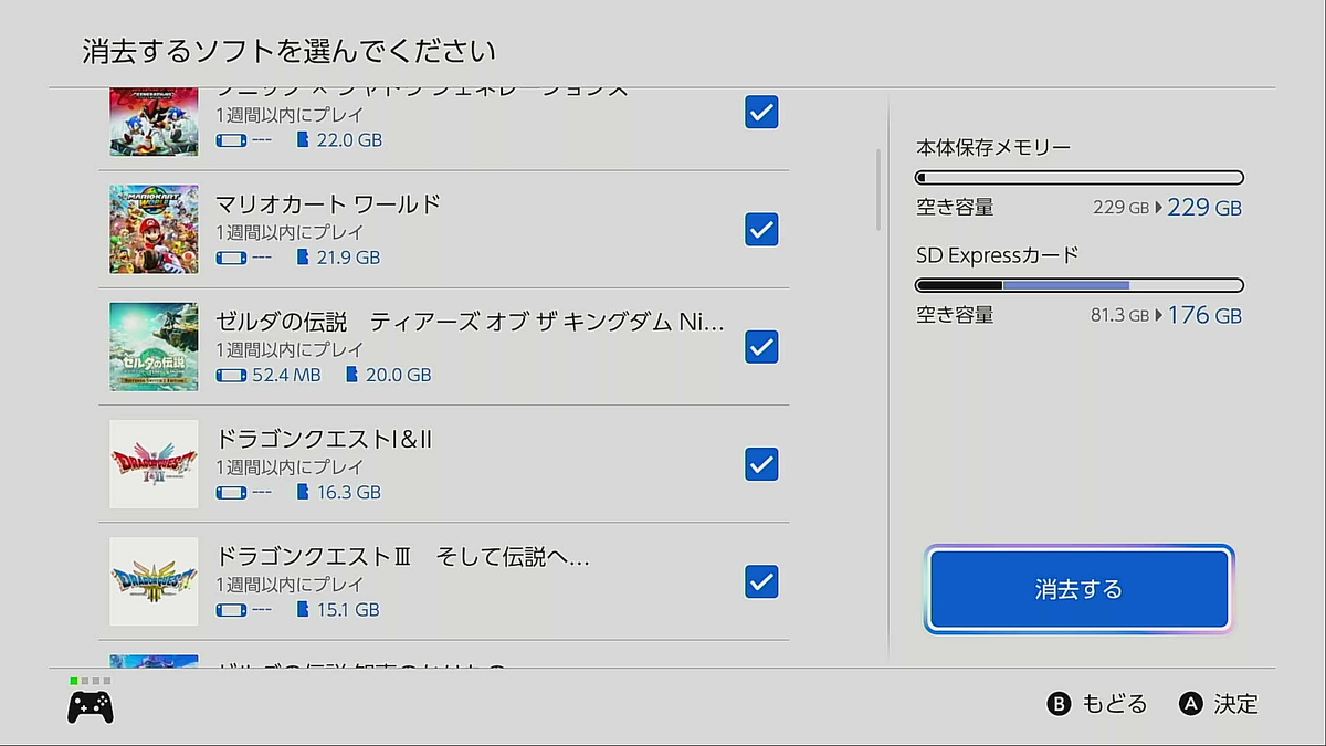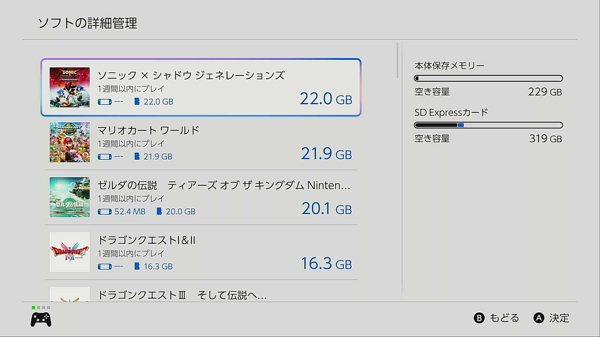 そこで、PCがない場合には次の方法がいいだろう。まず、本体の内蔵ストレージにすべて収まるように、保存しているソフトの中から容量の多いものやなるべく最新のものを削除して、microSD Expressカードに保存している残りのソフトやキャプチャデータなどをすべて内蔵ストレージに移動させ、microSD Expressカードを空にする。