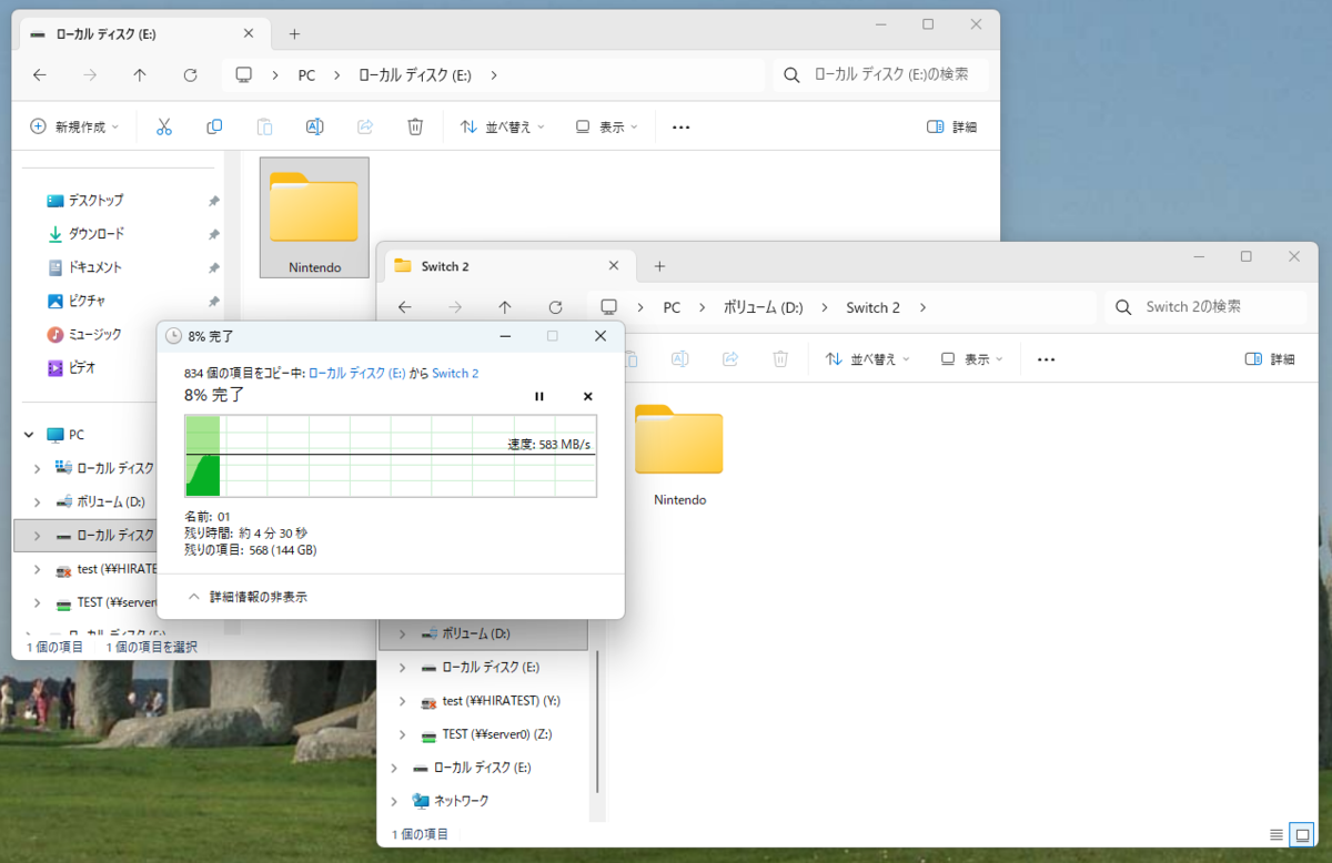 256GBのmicroSD ExpressからPC内のSSDにコピーするのに約5分。そのデータを新しい512GBのP9 Expressにコピーするのに約11分。つまり、合計で約16分かかった。