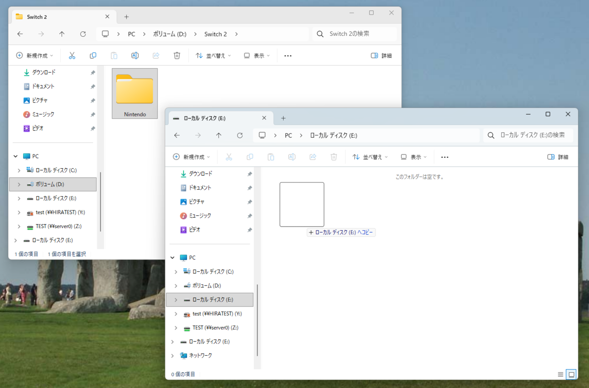 この場合、Switch 2から取り出したmicroSD Expressカードを、PCに接続したUSB接続のmicroSD Express対応リーダーライターやmicroSD Express非対応のリーダーライター、PC内蔵のmicroSDリーダーライターなどに取り付け、microSD Expressカード内の[Nintendo]フォルダをフォルダごとPC内のストレージにコピーする。