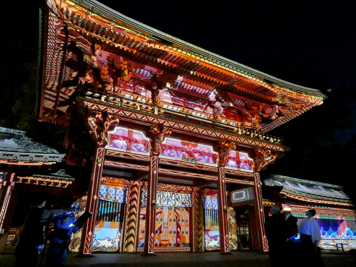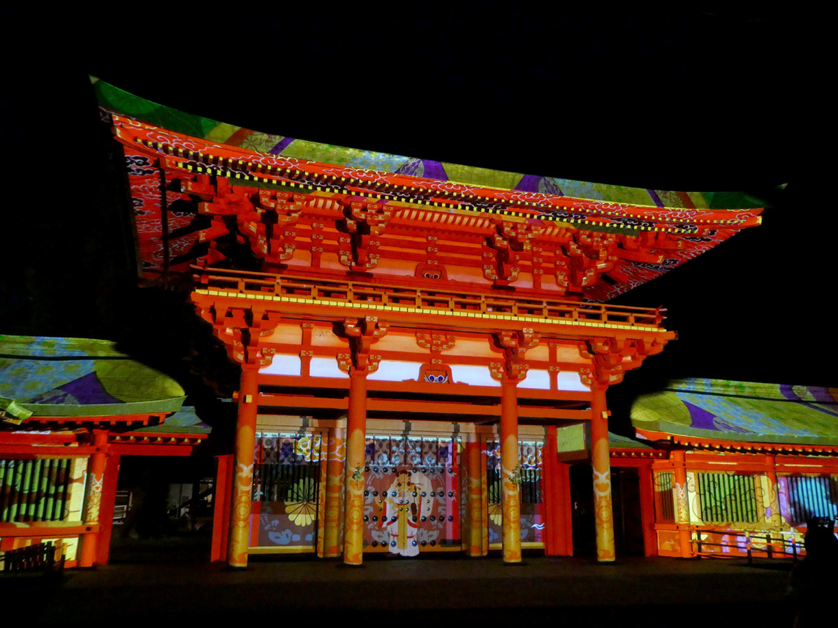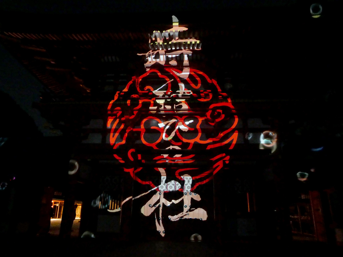 プロジェクションマッピングは3台のプロジェクターを使用し、パノラマ形式で映像を投影。楼門横の壁や楼門前の灯籠にも投影された映像が、視角いっぱいに広がり、迫力ある映像が楽しめる。