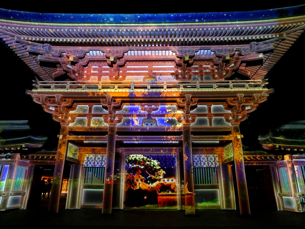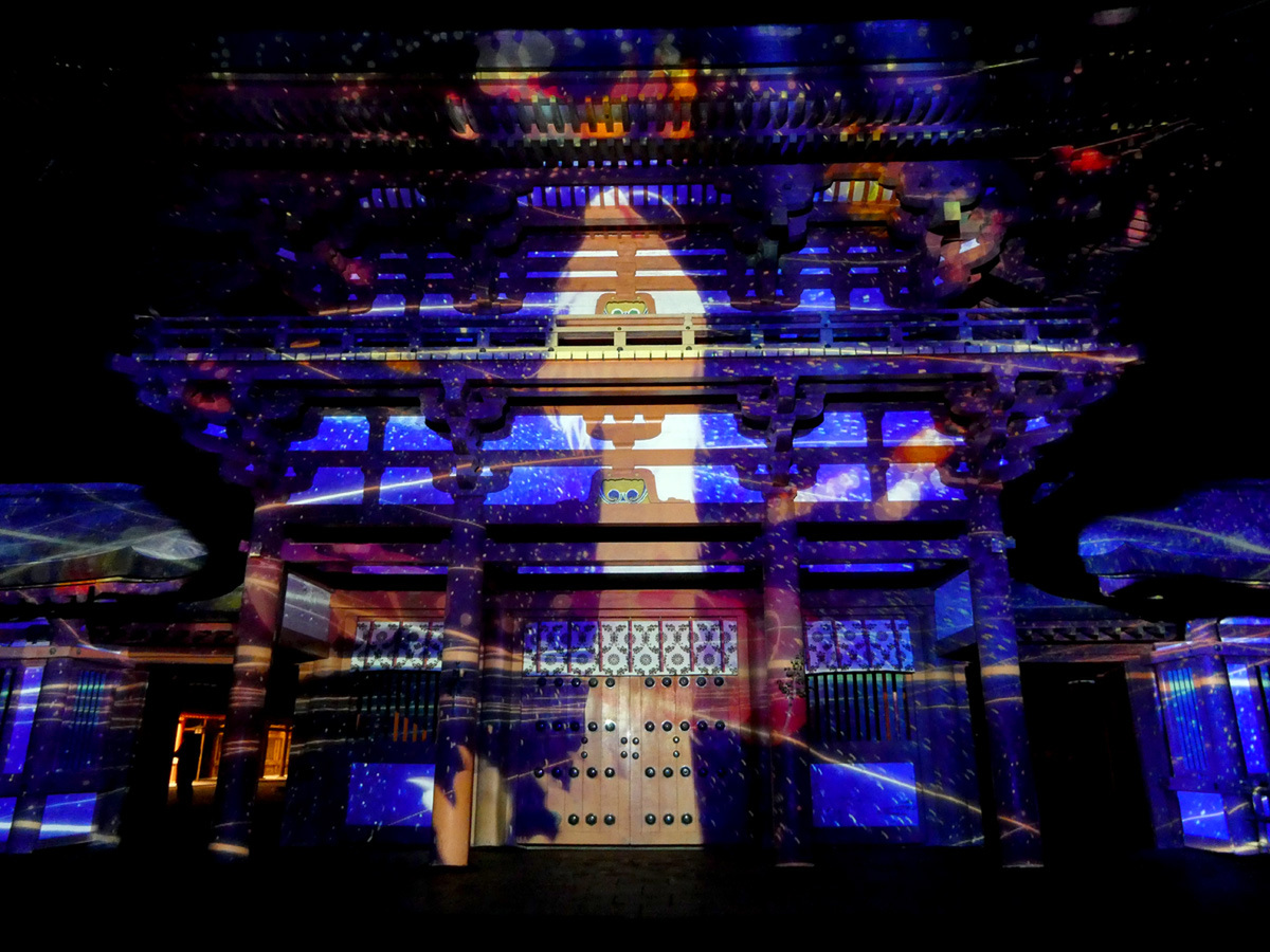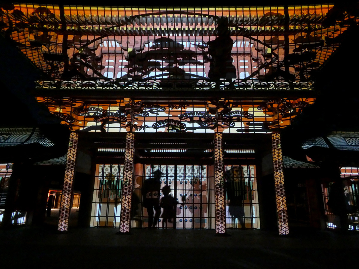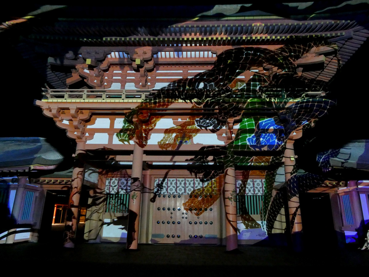 プロジェクションマッピングは3台のプロジェクターを使用し、パノラマ形式で映像を投影。楼門横の壁や楼門前の灯籠にも投影された映像が、視角いっぱいに広がり、迫力ある映像が楽しめる。