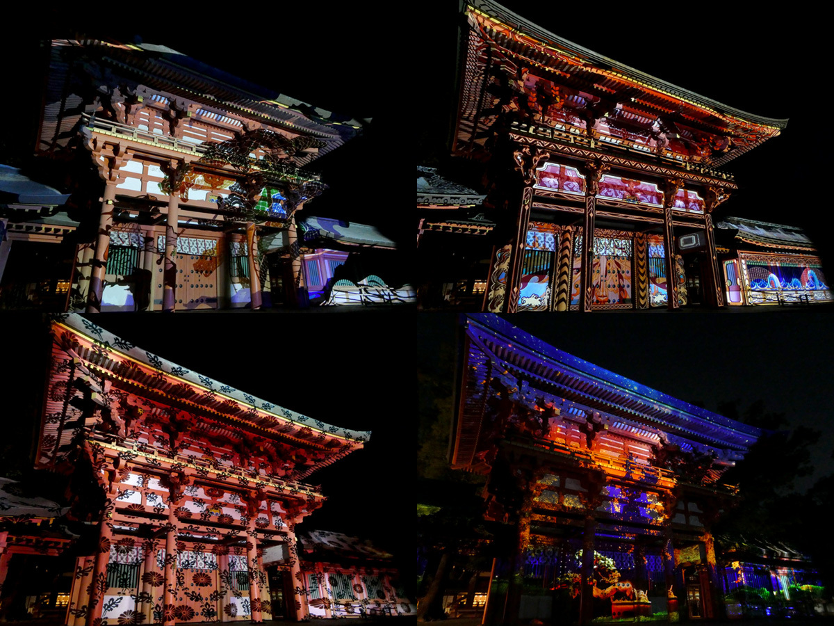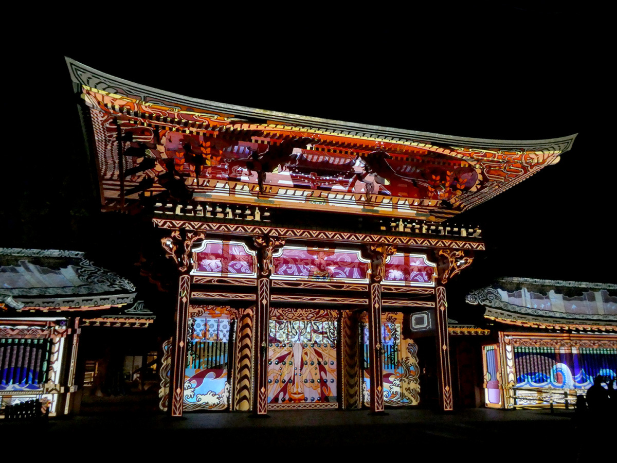 プロジェクションマッピングを投影するプロジェクターと楼門の距離がわりと近いので、全景を見る・撮るのはなかなか難しい。広く撮りたいときは横長のスマホで撮影するのがいいかも知れない。プロジェクションマッピングの光はかなり明るいので、露出を変えられるなら少し暗めにするのがいいだろう。