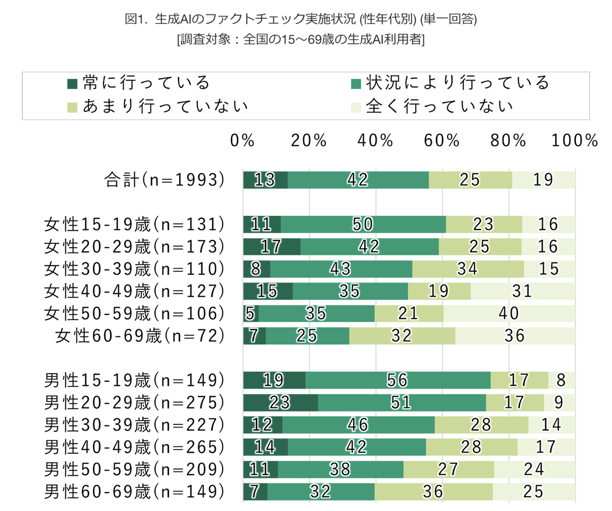 生成AIで自分が作った生成物のファクトチェックをしているか聞いたところ、ファクトチェックを「常に行なっている」のは13%、「状況により行なっている」は42%だった。なおファクトチェックとは、情報の正確性、妥当性を検証することを指す。多少なりともファクトチェックをしているのは5割強に過ぎず、4割弱は回答を受け入れてしまっているというわけだ。