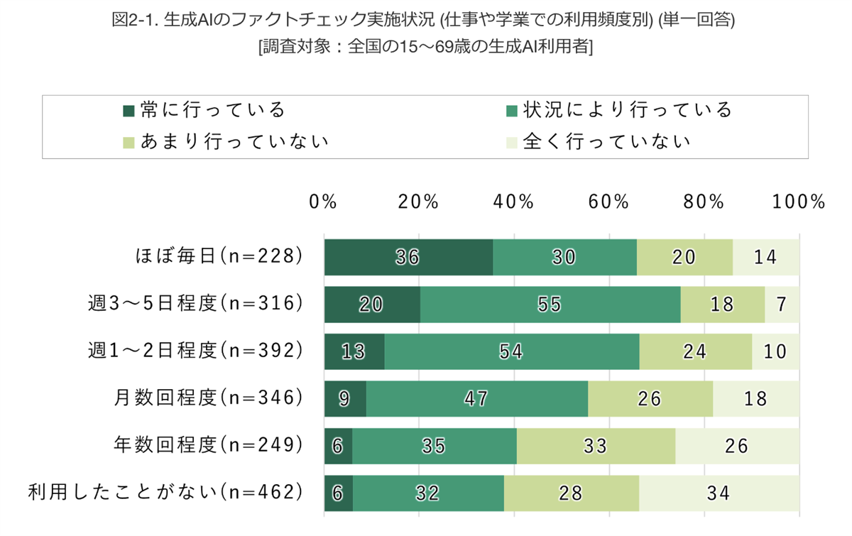 仕事や学業での生成AIの利用頻度別に集計したところ、利用頻度が多いほどファクトチェックを「常に行なっている」という回答が多く、「状況により行なっている」との合計も多くなっていた。