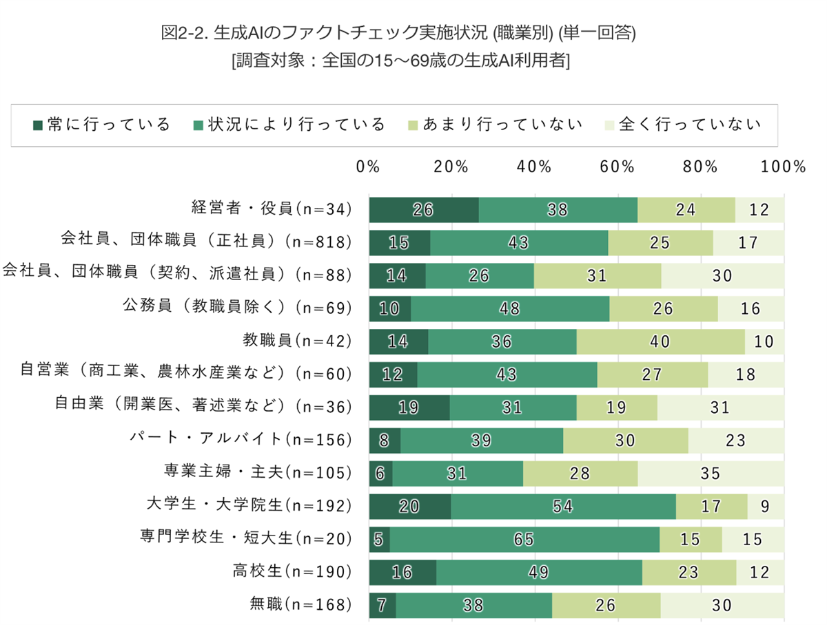 職業別にファクトチェック実施状況を集計したところ、大学生、高校生、経営者・役員、会社員ではファクトチェックしていると回答した割合が高くなっていた。学業や仕事に頻繁に活用する人ほど実施しているのだ。