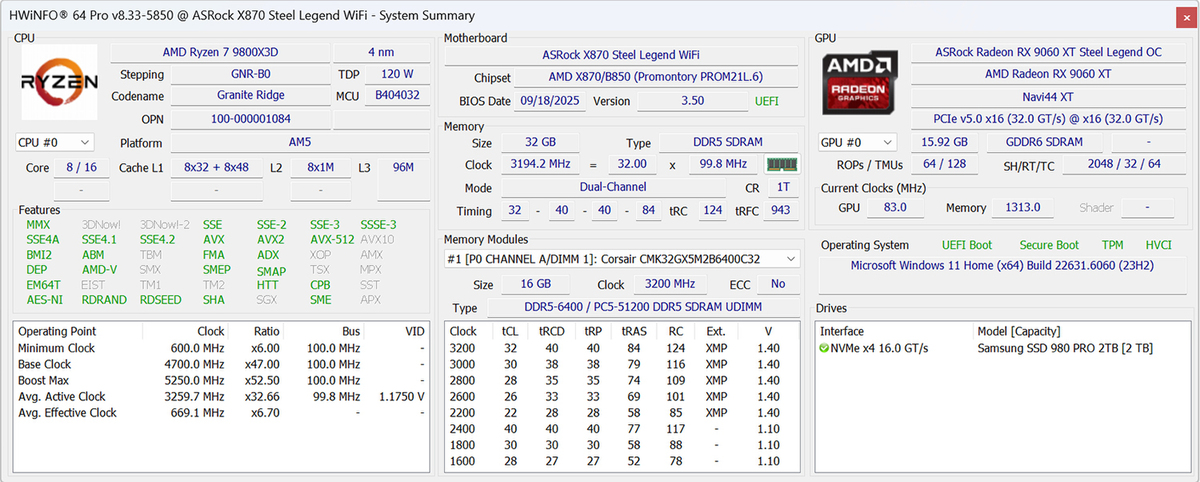 テストPCはコンパクトピラーレスPCケースのドスパラセレクト(MONTECH)「XR PASTEL BLUE」に、Ryzen 7 9800X3DやASRock「X870 Steel Legend WiFi」、ASRock「Radeon RX 9060 XT Steel Legend 16GB OC」などといったパーツを組み込んで構築した。