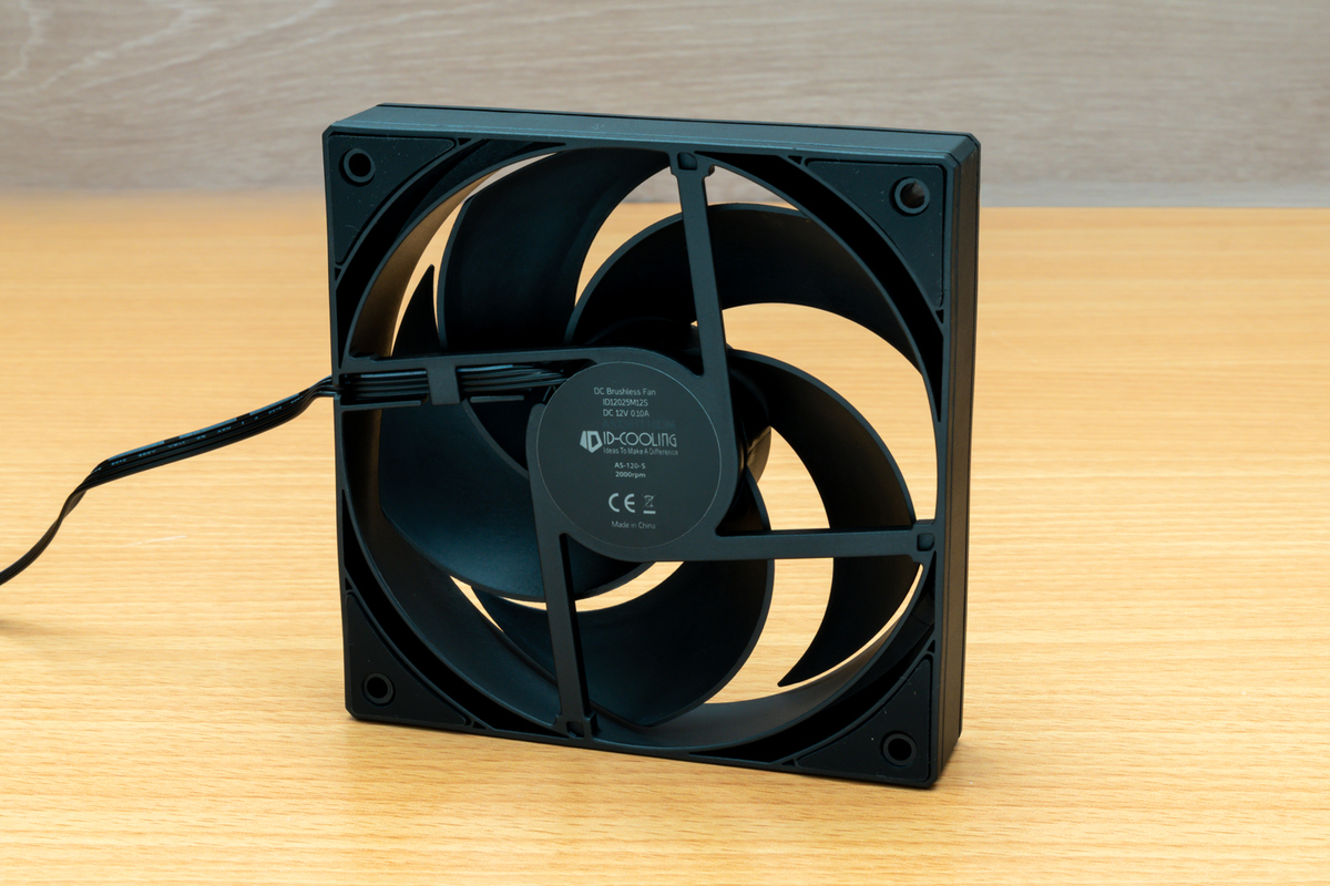 ファンはID-COOLING製120mm径PWMファン「AS-120-S」になる。5枚のブレードを備え、回転数300rpm ±200rpm~2000rpm±10%、最大風量58CFM、最大静圧1.94mmH2Oというスペックになっている。同社製ファンの「AS」シリーズに「AS-120-S」は存在していないが、回転数などのスペックは「AS-120-K」とほぼ同じなので、同製品をベースとしたCPUクーラー搭載向けモデルだろう。