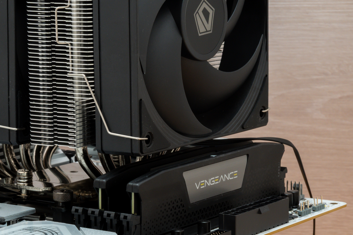 大型の空冷CPUクーラーで要注意点となるのがメモリーとの干渉になる。「FROZN A620 PRO SE」は、120mmファンとメモリーが干渉しやすい構造となっているが、メモリーヒートスプレッダーにLEDバーを搭載しない「Corsair VENGEANCE DDR5」は干渉せずに取り付けできた。