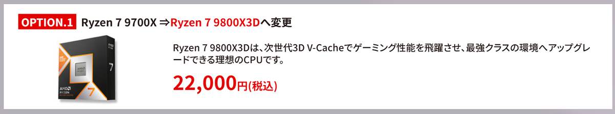 オプションではCPU、メモリー、ストレージ、ビデオカードをカスタマイズ可能。ちなみに、CPUは+2万2000円でRyzen 7 9800X3Dにアップグレードできます。同CPUはゲーミングにおいては最強格。ワンランク上のゲーミング環境を目指すならぜひ採用したいCPUですね。