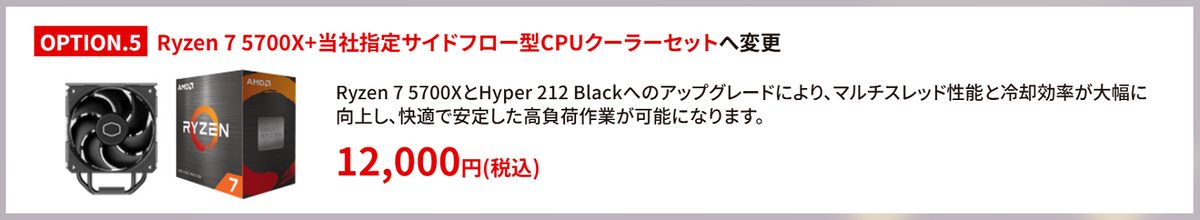 オプションではメモリー、ストレージ、CPUクーラー、CPU&CPUクーラーのセット、ビデオカード&電源ユニットのセットが選択可能。CPU&CPUクーラーはRyzen 5 5600GT&標準のリテールクーラーから、Ryzen 7 5700Xとサイドフロー型の空冷CPUクーラー(+1万2000円)に変更できます。もうちょっと性能が欲しい人にはぴったりなオプションだと思います。