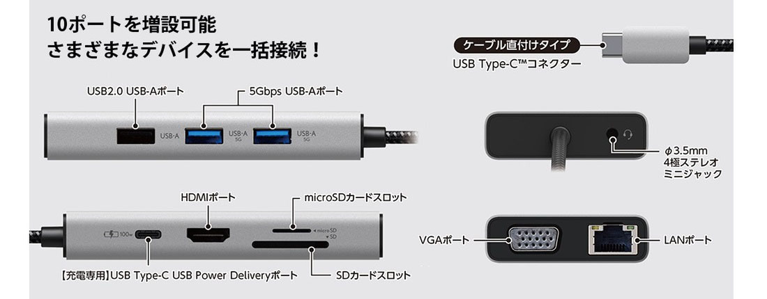 10ポート搭載、外部ディスプレイもUSB機器も一括接続