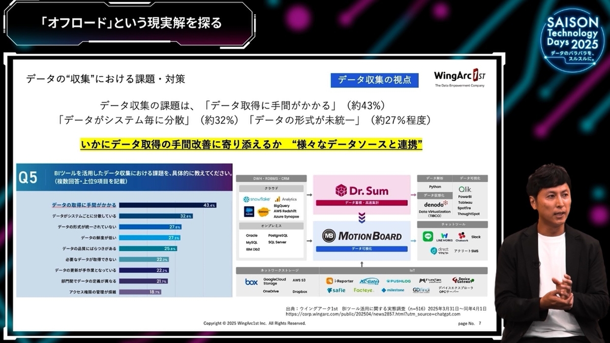 ウイングアーク 佐土原氏:データの観点では、収集と活用の2つの視点があります。まず、データ収集においては、当社の経営層や情シス向けのアンケートをみても、「取得に手間がかかる」「システム毎に分散」「形式が未統一」が課題のトップ3であり、いかに“データ取得の手間改善”に寄り添えるかが重要になっています。我々も様々なデータソースとの連携を進めていますが、iPaaSとの協業は必須だと感じています。