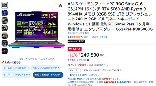 240Hzの超高速ディスプレイ、Ryzen 9 8940HX、RTX 5060というハイエンド構成を備えたモデルで、参考価格279,800円のところ、11%OFFの249,800円というお買い得価格で手に入ります。