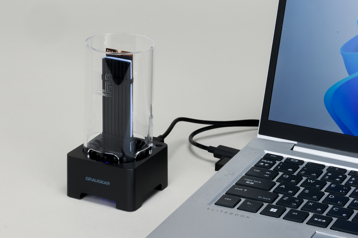 PCパーツ好きなら、思わず「なんだこれは!」と声を上げてしまいそうなこちら。GRAUGEARの「G-M2DK-U4-40G」は、M.2 SSDを挿して使う“お立ち台”型のSSDエンクロージャー(?)です。SSDを立てたまま使うデザインはインパクト抜群で、机の上で目を引きます。