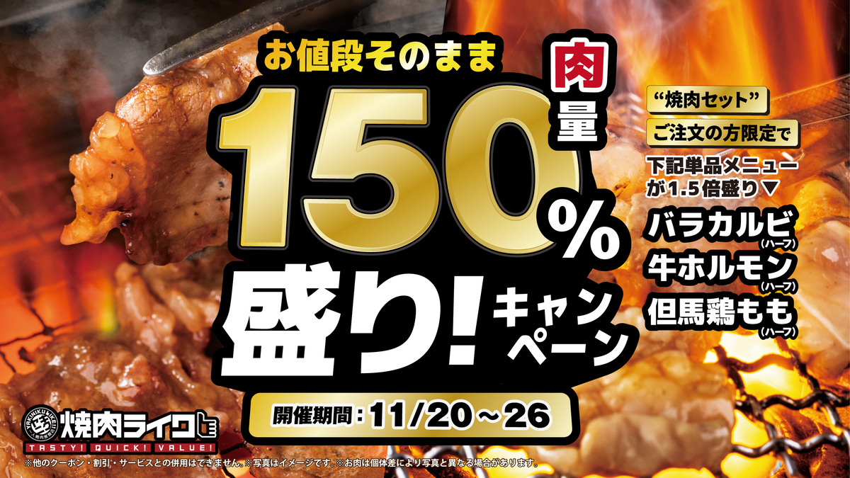 焼肉ライクは11月20日~26日の期間限定で、“お値段そのまま”で肉量150%盛りキャンペーンを開催する。増量するのは対象の単品肉(ハーフ)限定で、焼肉セットの注文が条件。