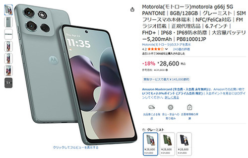 【セール】Motorola(モトローラ)motorola g66j 5G PANTONE 8GB/128GB 登場!