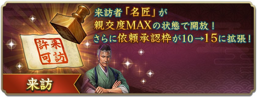購入することで追加来訪者「名匠」が親交度MAXの状態で開放され、来訪者依頼の承認可能枠が+5される「来訪パック・来訪者開放」を販売する。