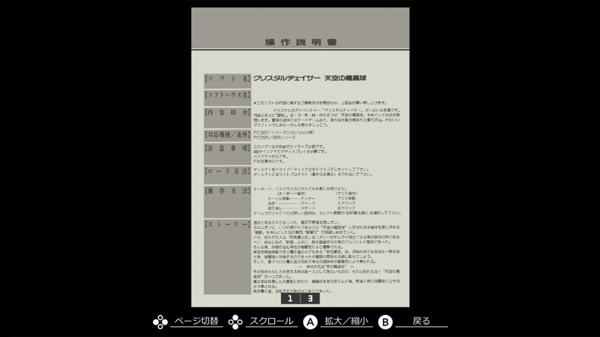『EGGコンソール クリスタルチェイサー~天空の魔晶球~-R PC-9801』は、原作版の貴重なパッケージデザインやマニュアルをいつでも閲覧できる「ギャラリーモード」に対応。
