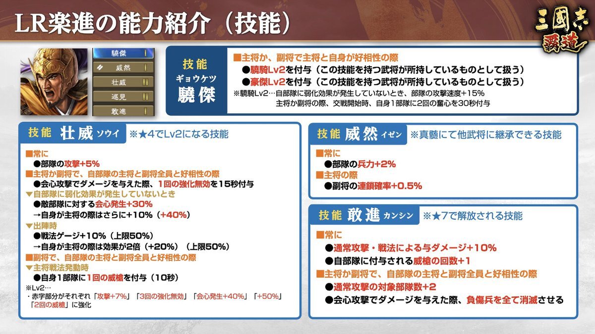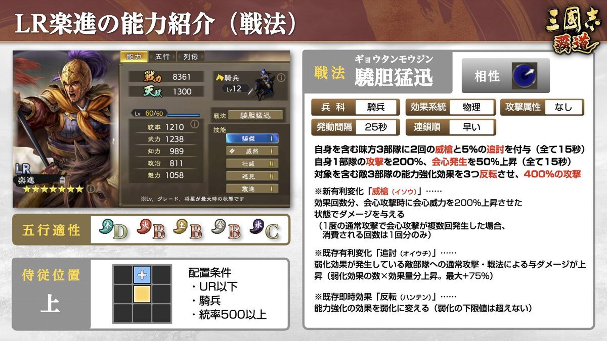 会心攻撃時に会心威力を大きく上昇させた状態でダメージを与える新有利変化「威槍」を付与可能で、戦法で自部隊の会心性能を大きく強化し、大ダメージを狙える騎兵武将LR「楽進」。