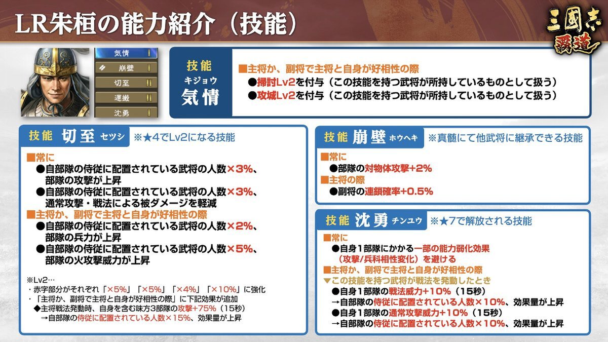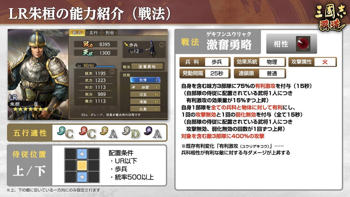 自部隊の侍従の人数に応じて、部隊の攻撃や火攻撃威力を上昇させる技能を持ち、多くの侍従を配置することで部隊の火力を大幅に強化可能な歩兵武将LR「朱桓」。