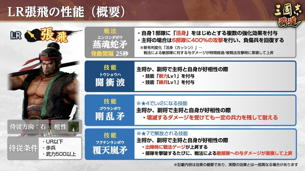LR張飛は、高い耐久性を持ち、敵から攻撃を受けるたび/敵を撃破するたびに強くなる、攻守一体の歩兵武将。