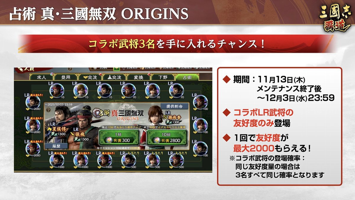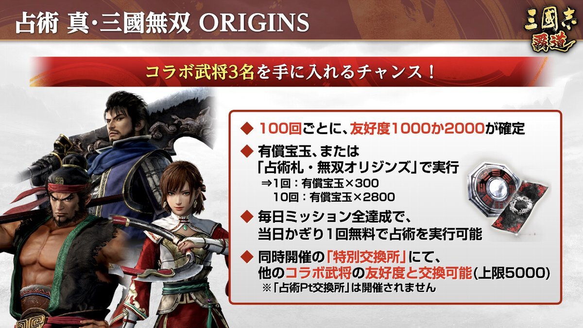 『真・三國無双 ORIGINS』コラボでは、LR張飛、LR孫尚香、LR夏侯惇の3名が武将として『三國志 覇道』に登場。3名は専用の「占術 真・三國無双 ORIGINS」から手に入れられる。